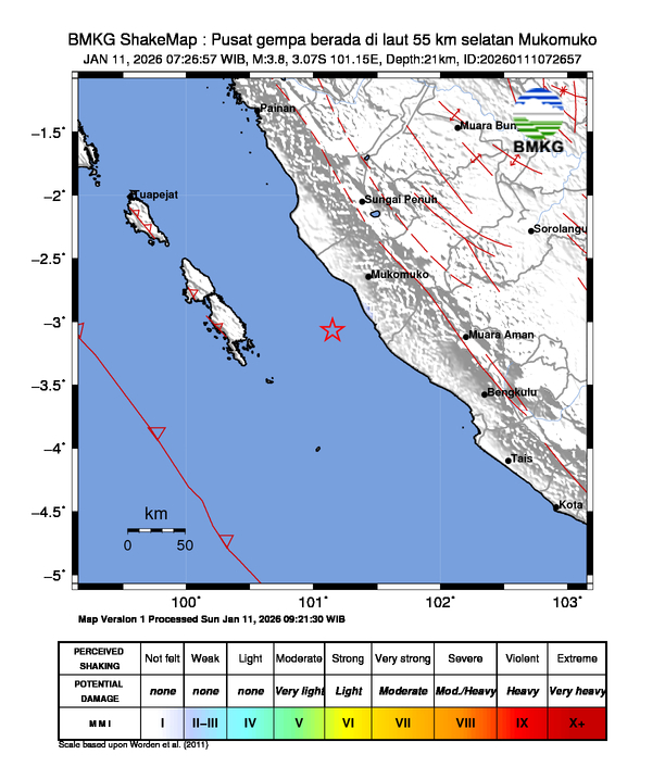 Pusat gempa berada di laut 55 km selatan Mukomuko