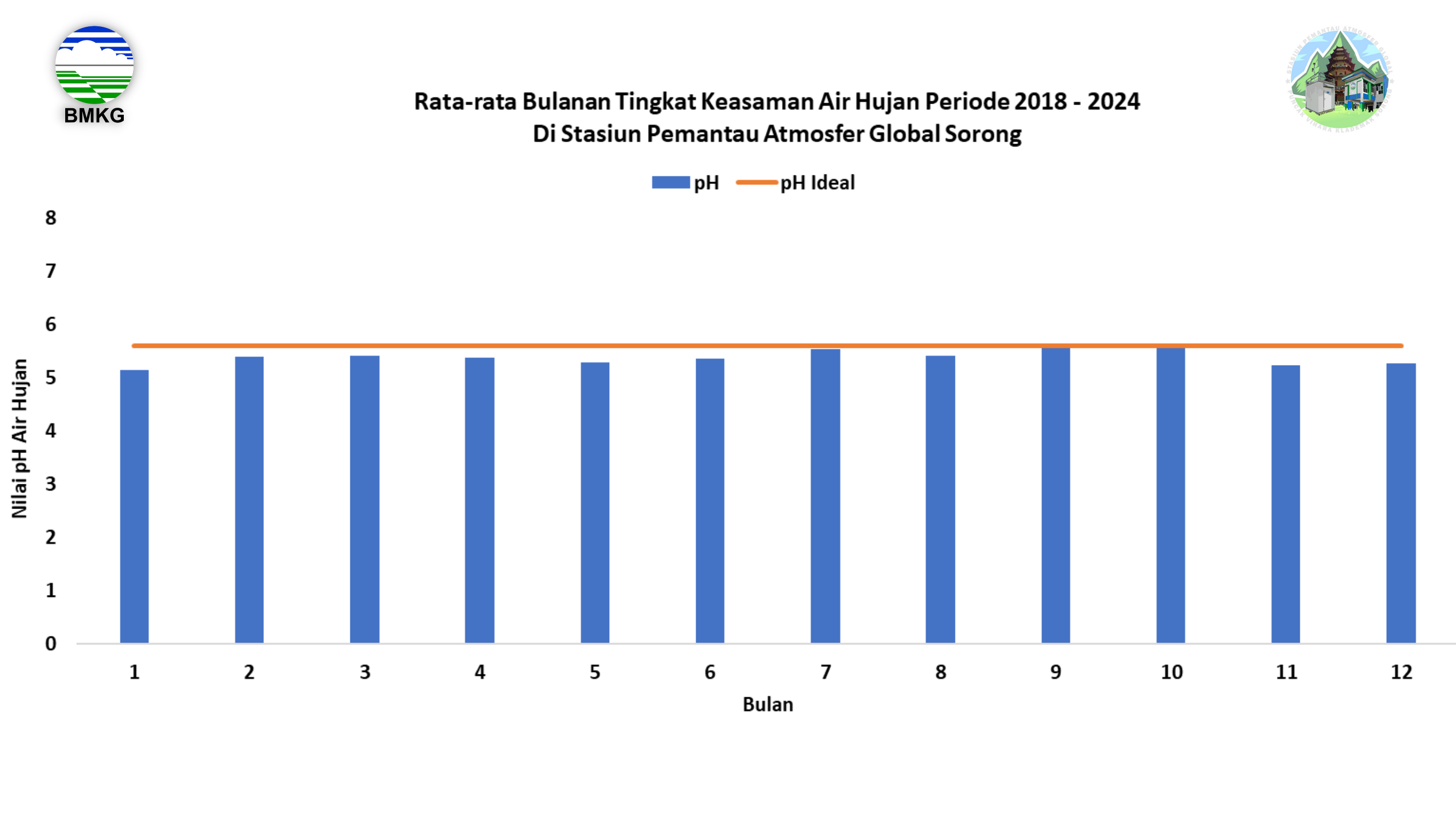 Tingkat Keasaman air hujan di Stasiun Pemantau Atmosfer Global (GAW) Sorong selama tahun 2018 – 2024 adalah sebagai berikut: